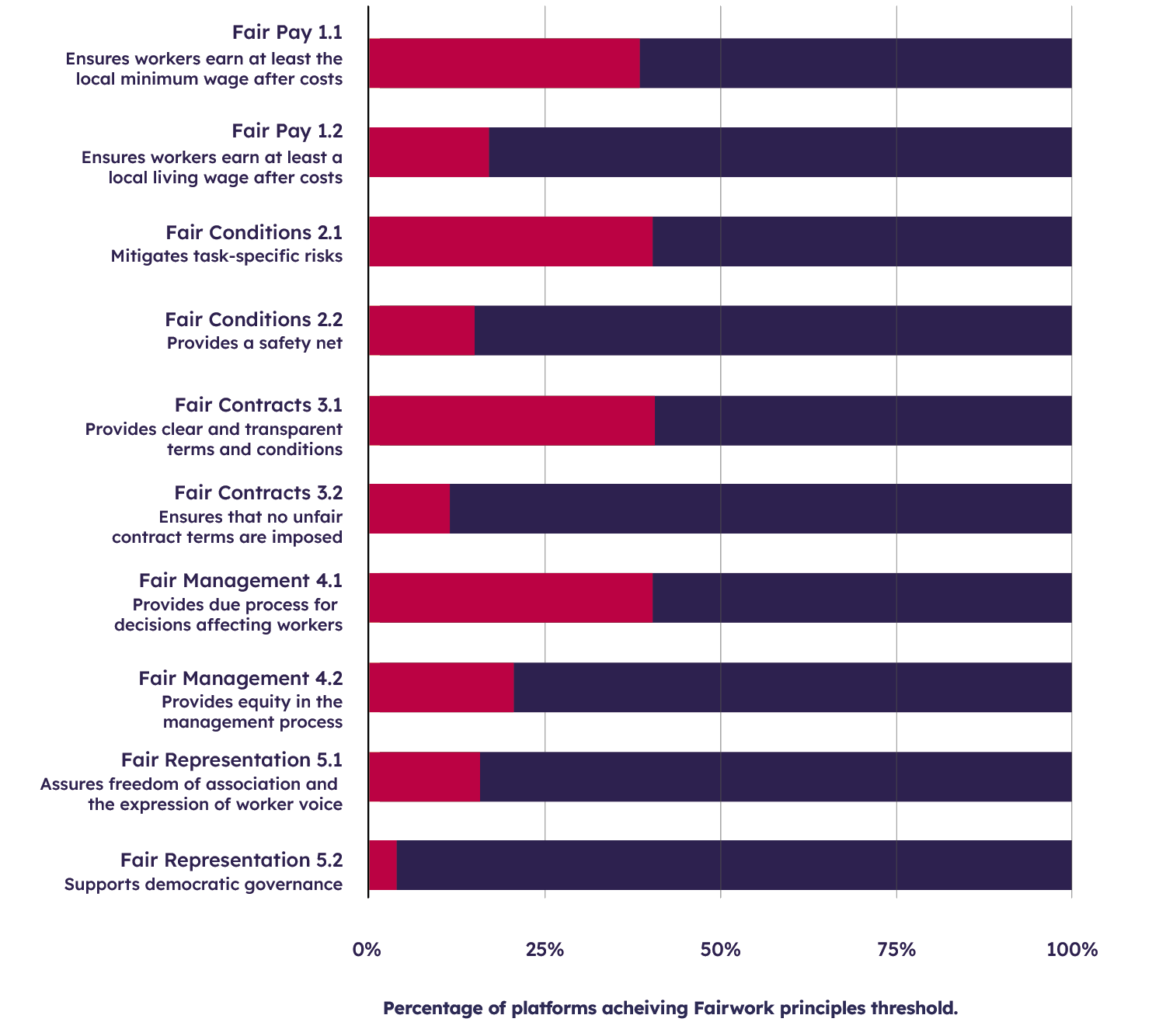 In general, cloudwork platforms are still not close to safeguarding the basic standards of fair work expressed in our five principles. One platform scored seven points (Prolific) out of 10, one scored five (Jovoto), and one scored four (Workana). For the other 12 platforms, we were unable to evidence that they met more than three of our ten thresholds. For four platforms, we could not find evidence that they met any threshold.